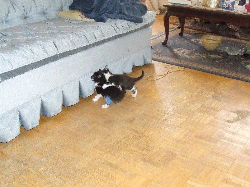 Jazzie welcoming Isidore back from the pet hospital, 18 March 2010.