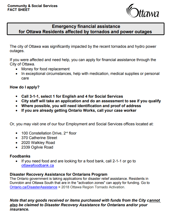 The City of Ottawa has released information about emergency financial assistance for those affected by the tornado.